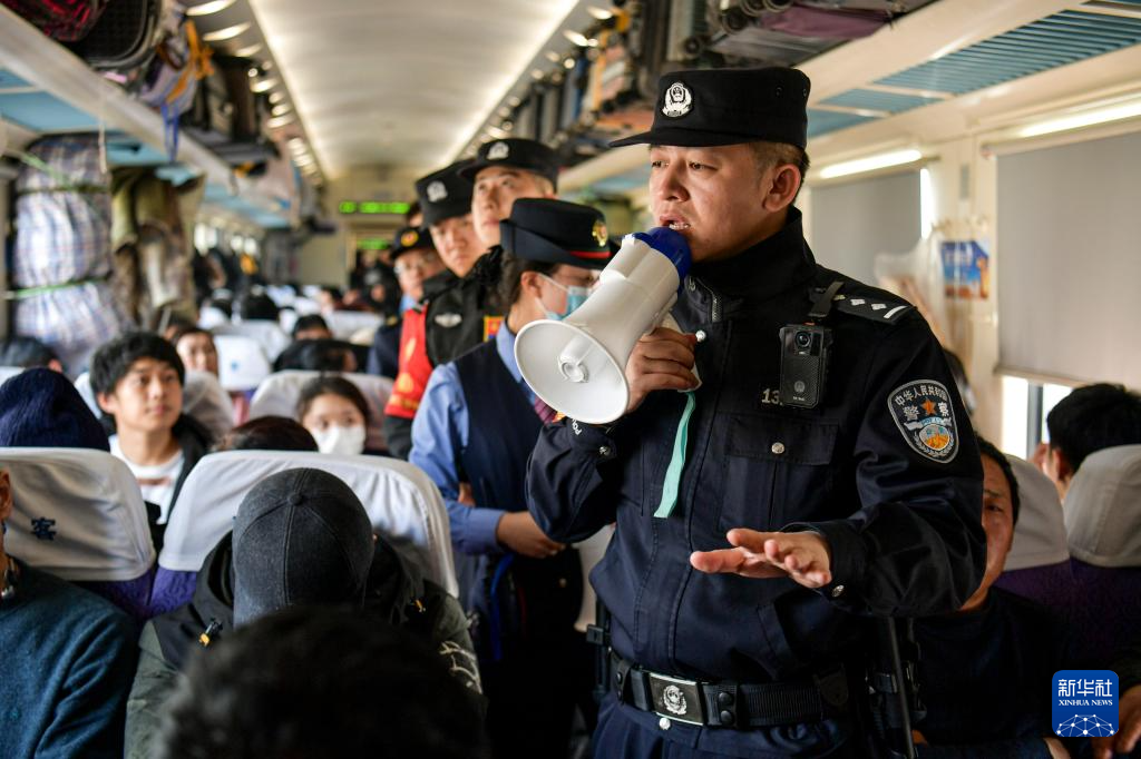在Z70次列车上,张威(右)向旅客做安全出行提醒(1月11日摄)。