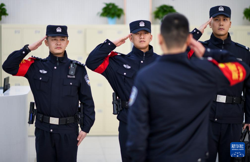 在乌鲁木齐铁路公安处乘警支队智慧乘务大厅,张威(左一)等准备出乘(1月11日摄)。
