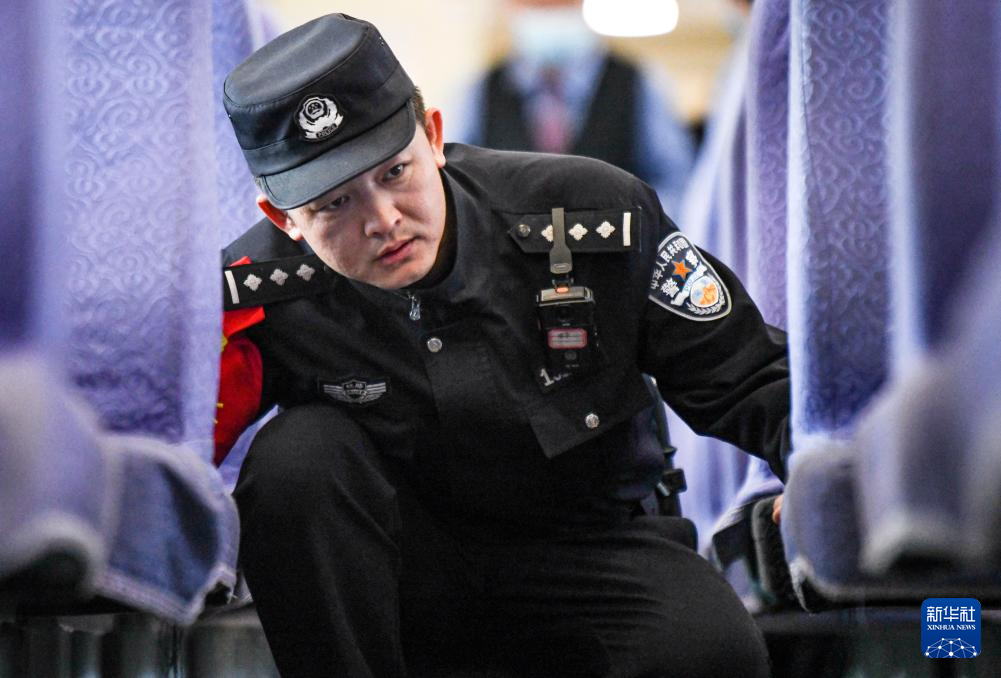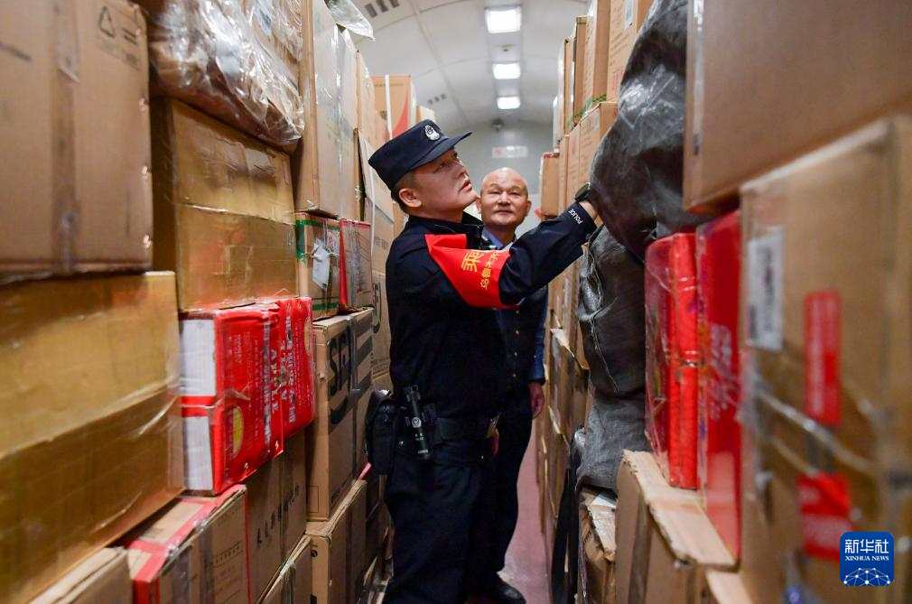 在Z70次列车上,张威(左)与乘务人员一起在行李车厢进行安全检查(1月11日摄)。