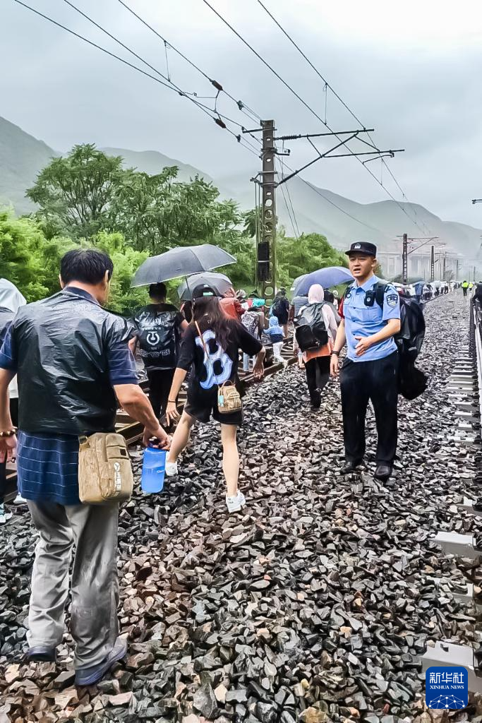 因暴雨被困于门头沟时,张威(右)护送旅客向安全地方转移(2023年7月31日摄)。