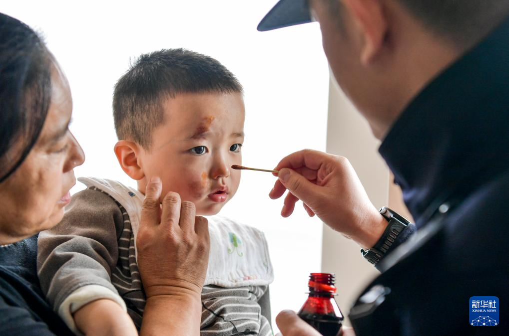 在Z69次列车上,张威(右)为一名不慎摔倒的小乘客搽药(1月13日摄)。