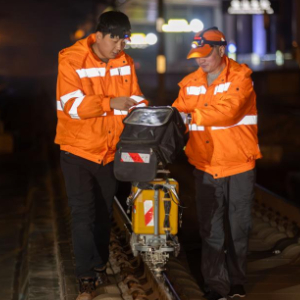 1月18日凌晨,上海高铁基础设施段综合维修工使用电子焊缝平直尺对钢轨焊缝平直度进行测量。