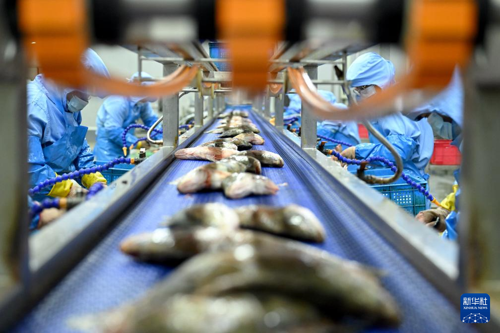 1月11日,在黄山市休宁县的黄山皖新徽三食品供应链有限公司内,工人在生产线上加工制作臭鳜鱼。