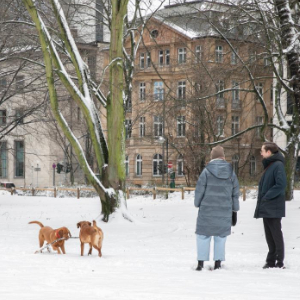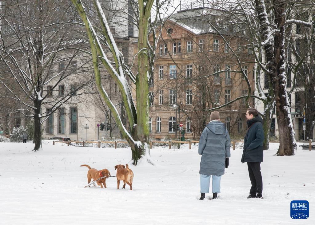 1月18日,在德国法兰克福,人们带着狗在大雪覆盖的草坪上玩耍。
