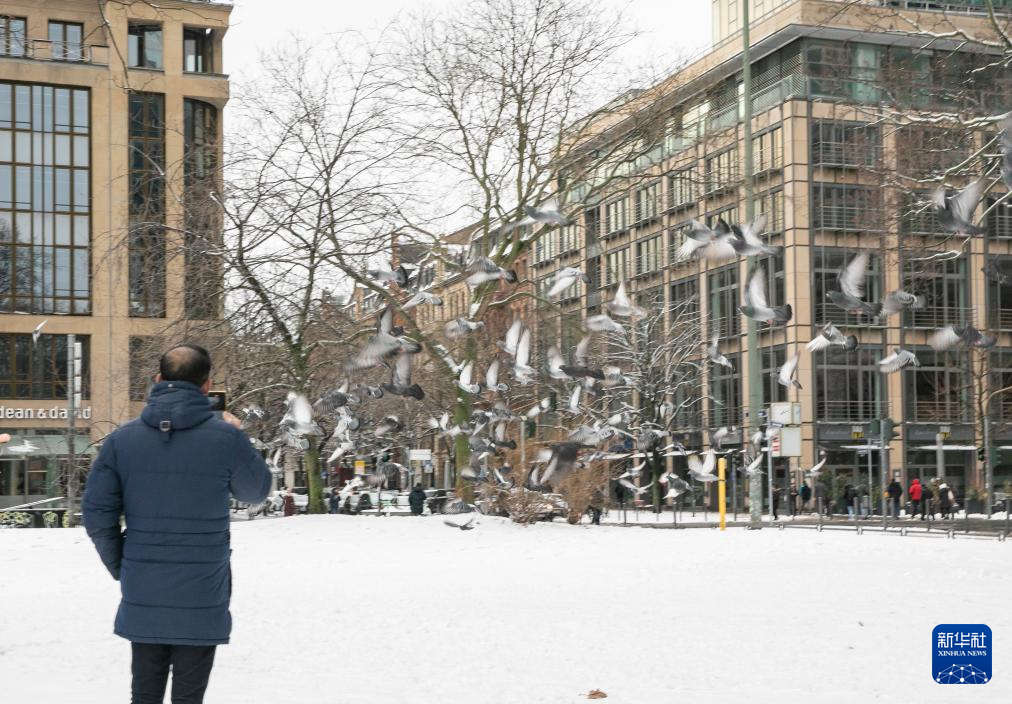 1月18日,在德国法兰克福,一名男子在雪地上拍摄鸽子。