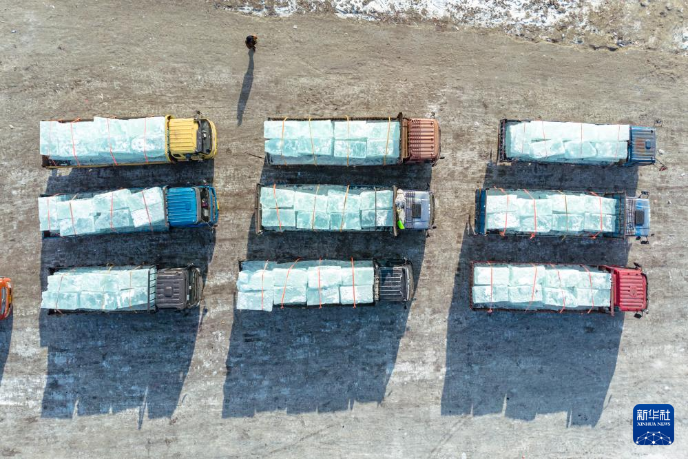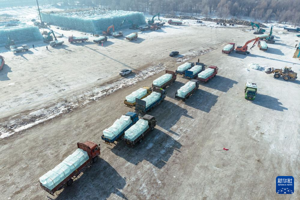 1月19日,在哈尔滨市松北区,运冰车将切割好的冰块运至哈尔滨冰雪大世界存冰场(无人机照片)。