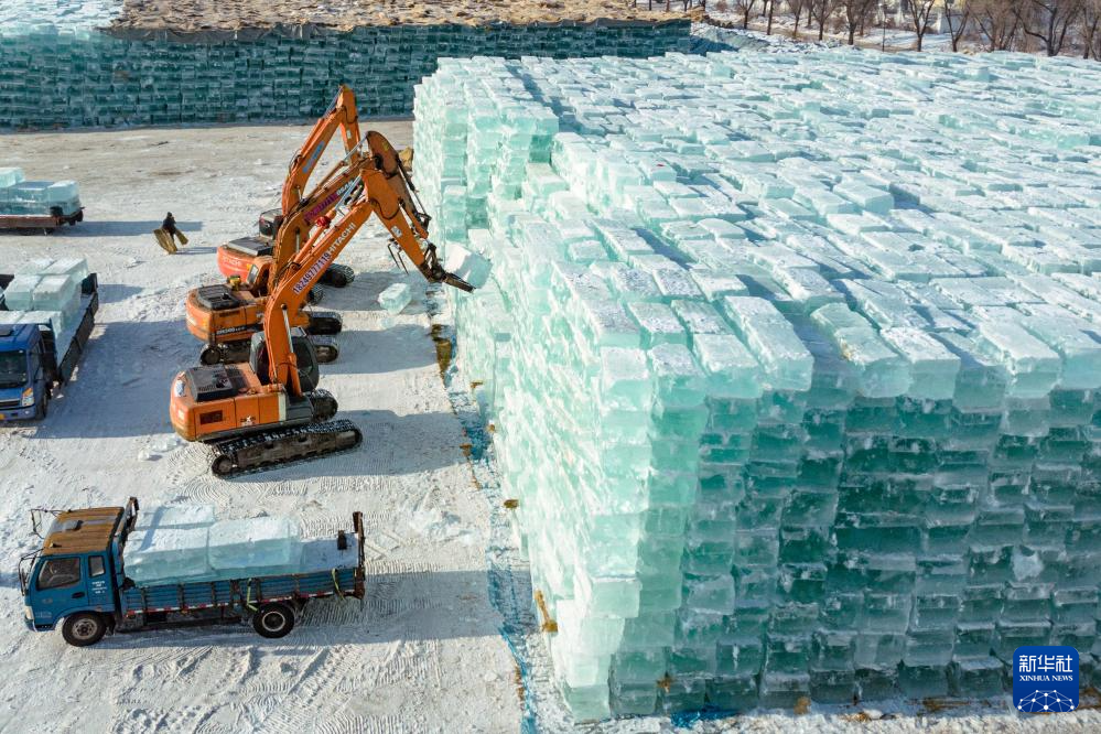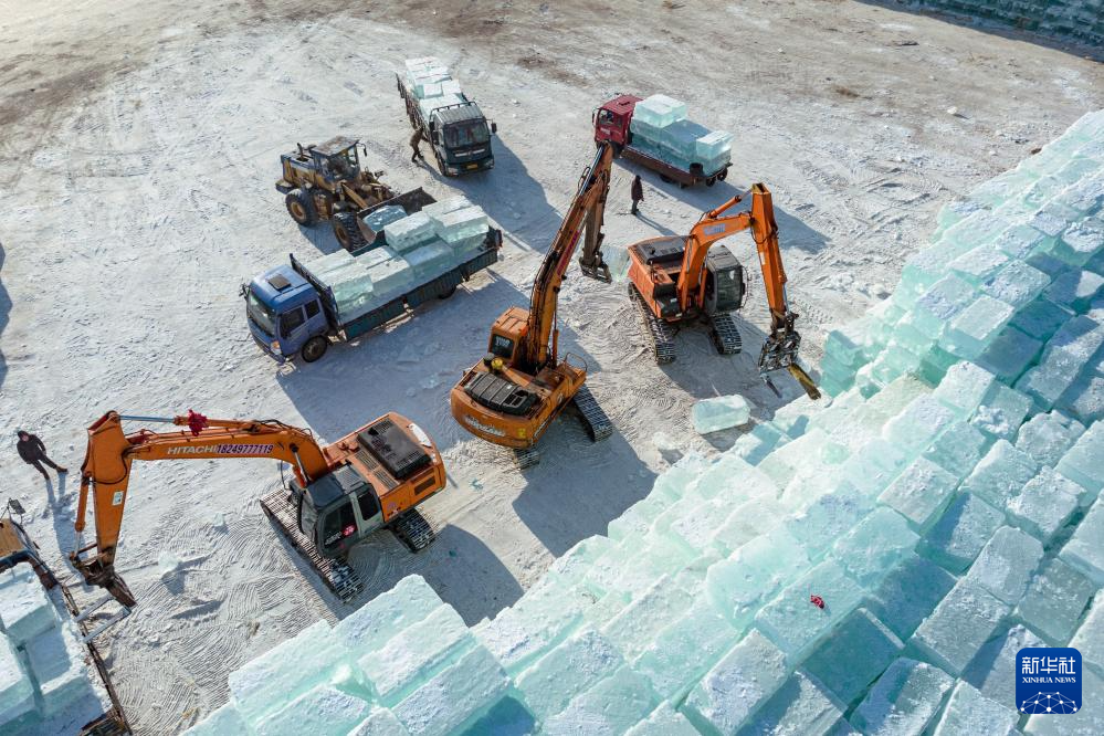 1月19日,工人操控机械在哈尔滨冰雪大世界存冰场码放冰垛(无人机照片)。