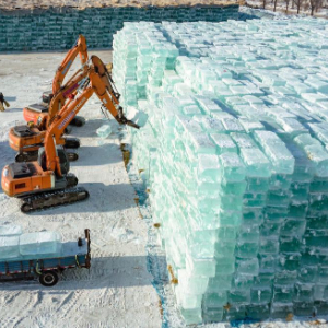 眼下,哈尔滨冰雪大世界的存冰工作正紧张进行。工人先在冰封的松花江江面上找到合适的采冰区域,使用专业工具将冰切割下来,再由运冰车将每块重达数百斤的冰运往存冰场。大型机械将冰块堆放成整齐的冰垛储存,为下一个冰雪季做准备。
