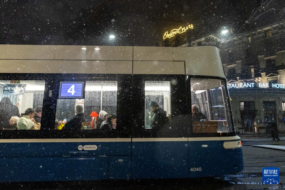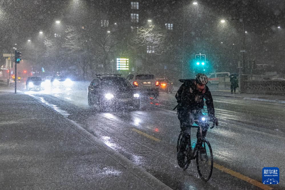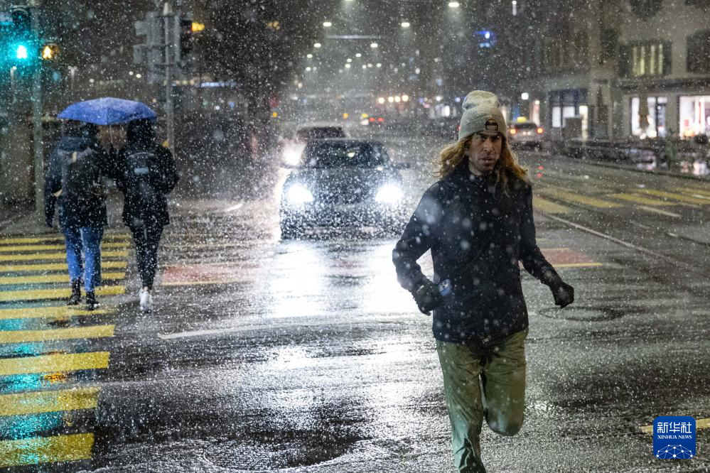 这是1月18日夜间拍摄的瑞士苏黎世街头雪景。