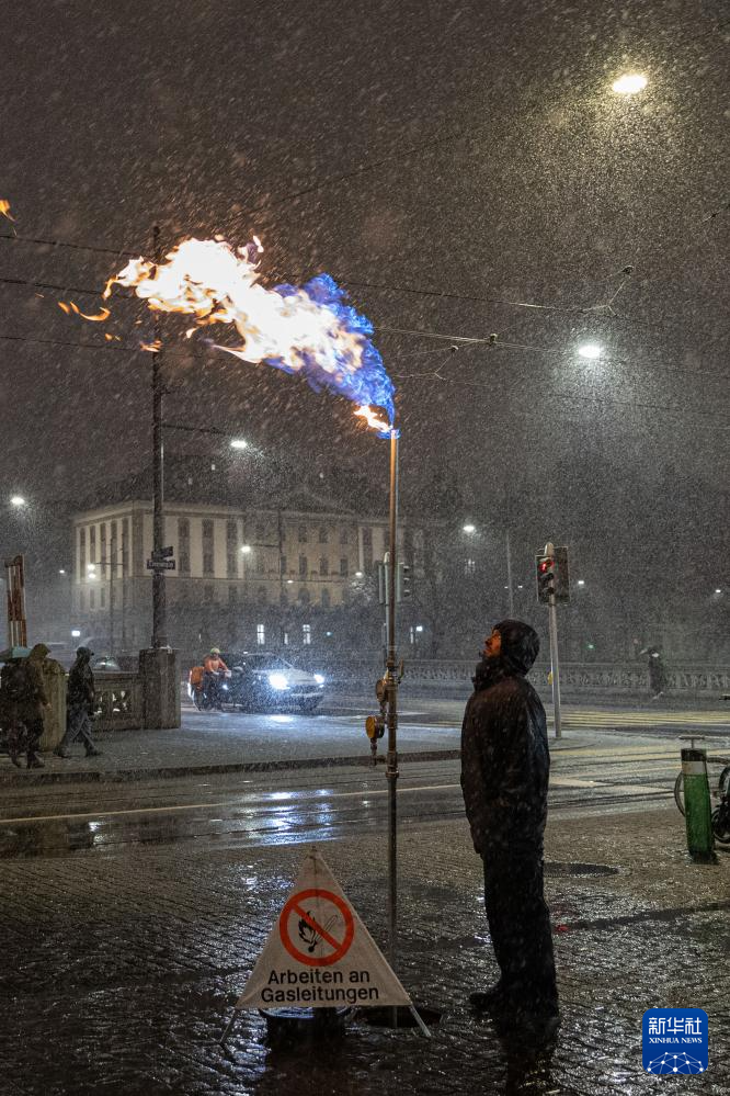 1月18日,一名工人在瑞士苏黎世街头检修燃气管道。