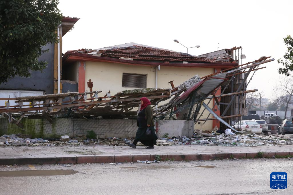 2024年1月18日,在土耳其安塔基亚,一名女子路过一幢破损的建筑。