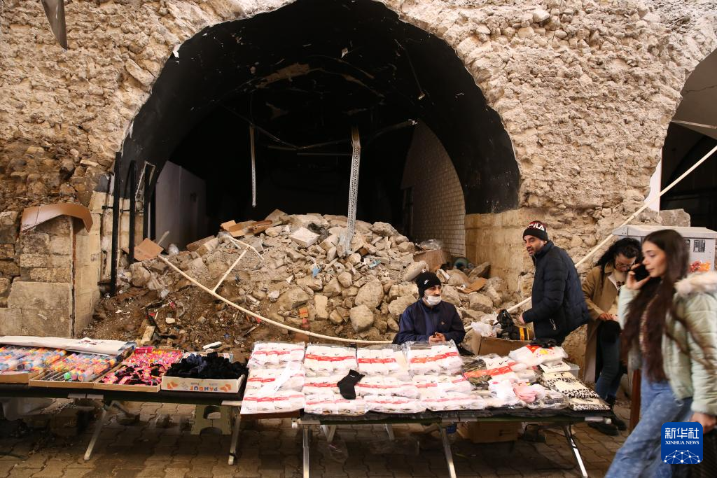 2024年1月18日,在土耳其安塔基亚,一名商贩在废墟前售卖。