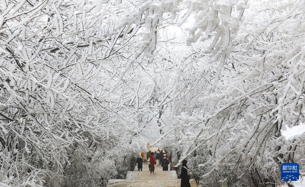 1月19日,游人在江苏连云港市花果山玉女峰观赏雾凇。