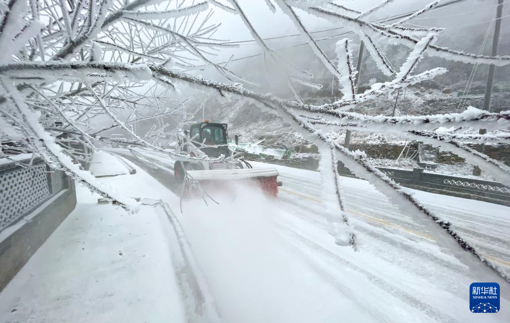 1月19日,在241国道湖北省保康县后坪镇红岩寺路段,公路养护工人在进行除雪作业。