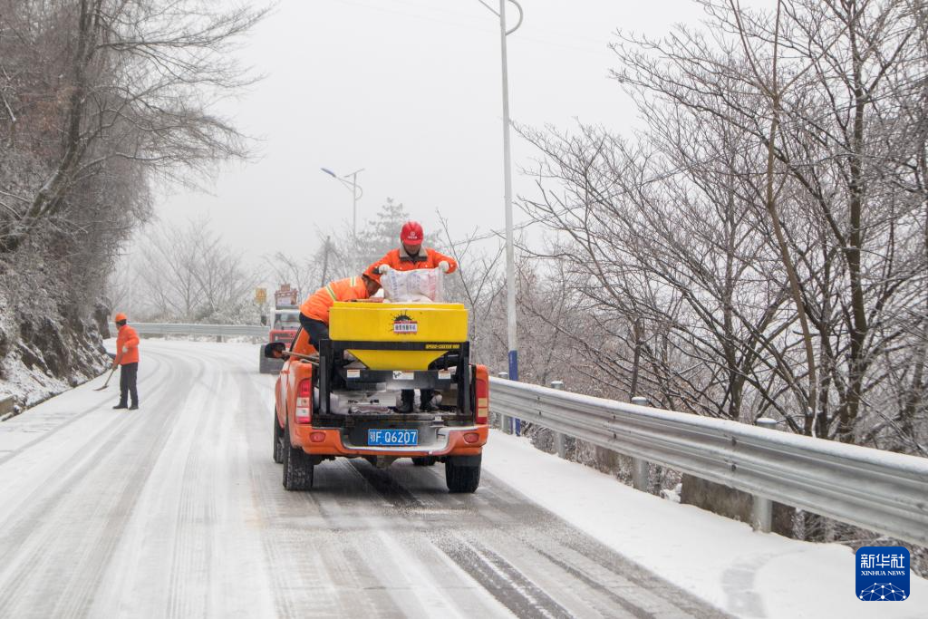 1月19日,在241国道湖北省保康县后坪镇红岩寺路段,公路养护工人在撒融雪剂。