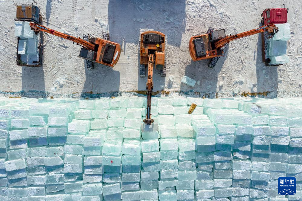 1月19日,工人操控机械在哈尔滨冰雪大世界存冰场码放冰垛(无人机照片)。
