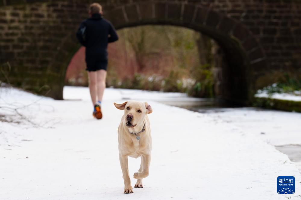 1月19日,一只小狗在英国英格兰北部的雪地上玩耍。