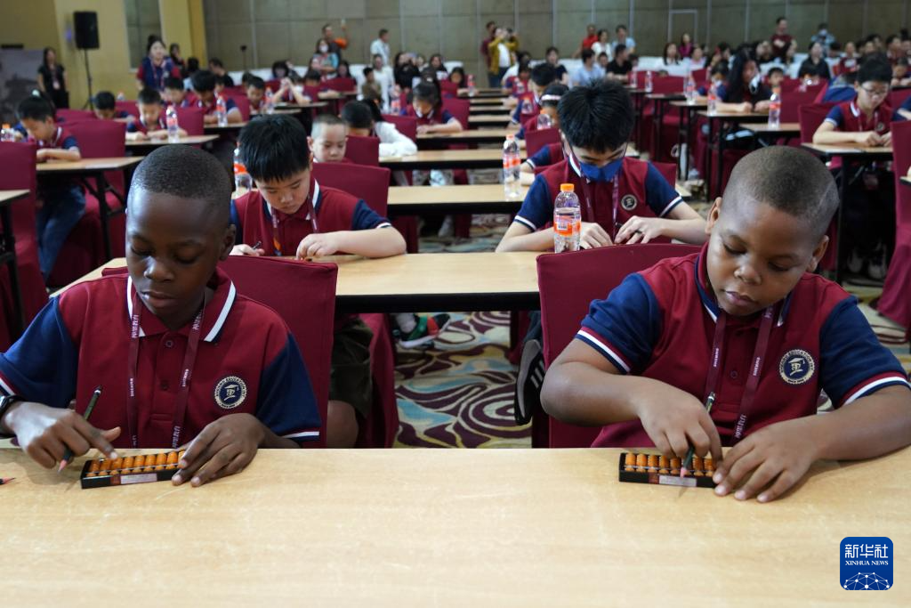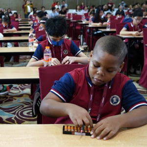 1月20日,在印度尼西亚万隆,参赛小选手在正式开始答题前进行珠算热身练习。