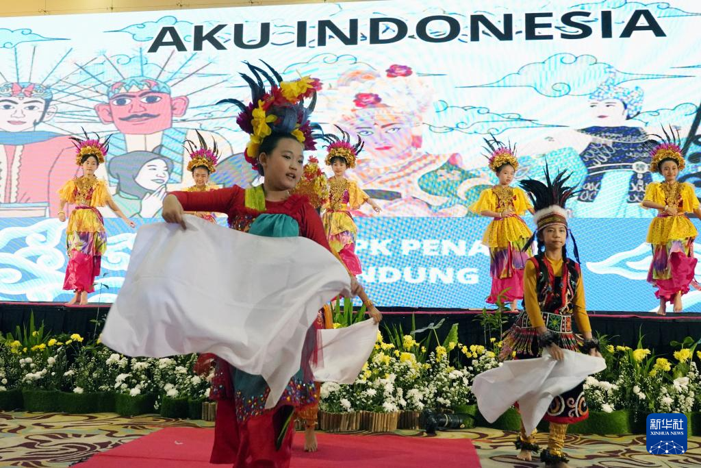 1月20日,在印度尼西亚万隆,来自印度尼西亚的小朋友在比赛现场表演舞蹈。