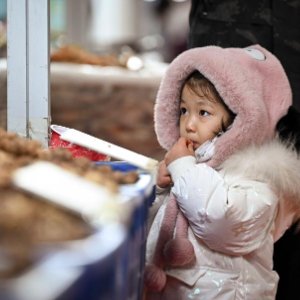 1月20日,一名小朋友在购物节上品尝干果。