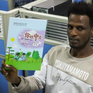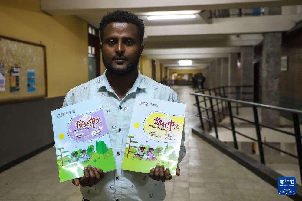 1月18日,在埃塞俄比亚亚的斯亚贝巴大学孔子学院,一名参加培训的本土中文教师展示中文教材。