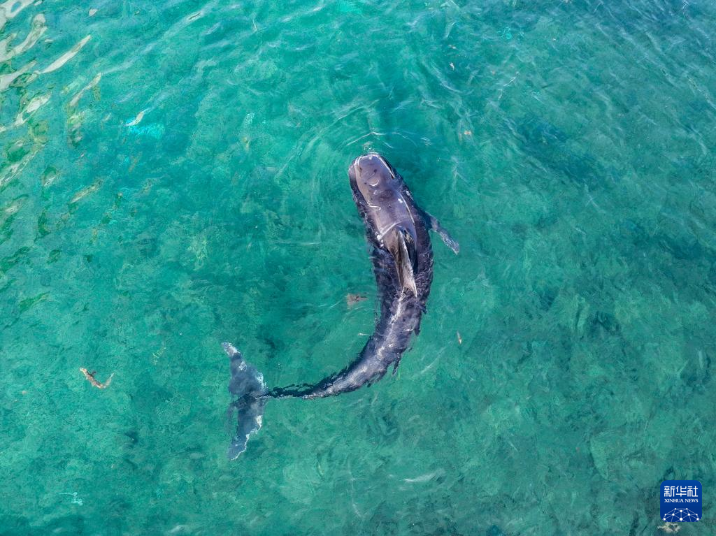 这是1月21日在三亚海昌生物保育中心拍摄的短肢领航鲸“海棠”(无人机照片)。