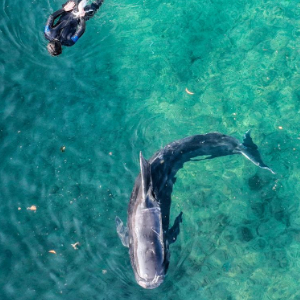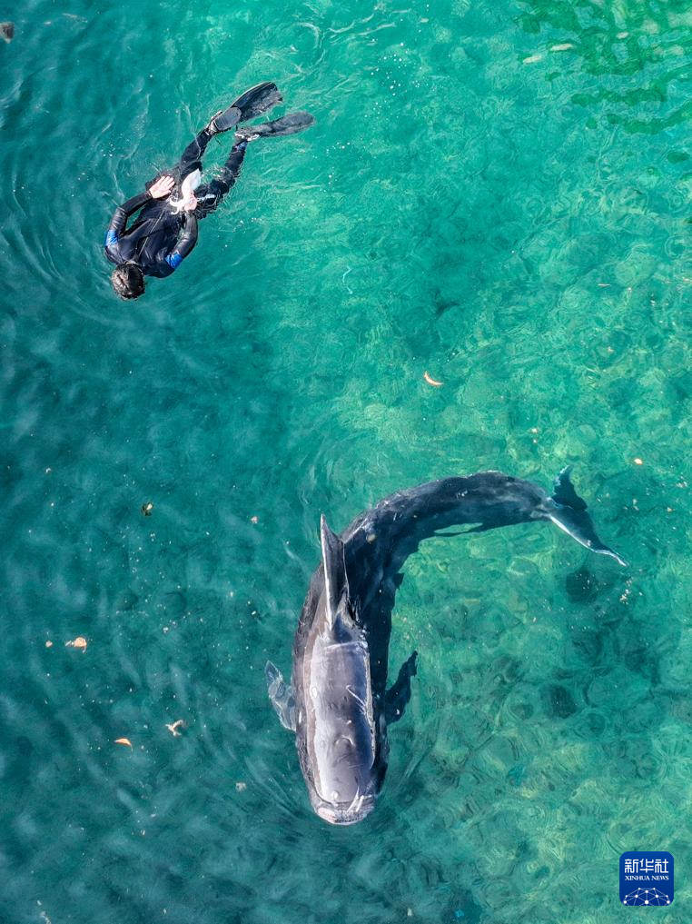 1月21日,三亚海昌生物保育中心的工作人员在水中观察短肢领航鲸“海棠”的状态,以免其发生意外(无人机照片)。