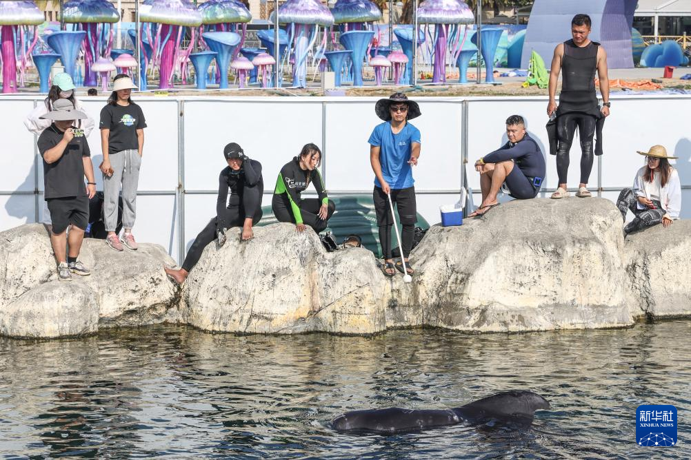 1月21日,蓝丝带海洋保护协会的志愿者在三亚海昌生物保育中心清理异物,防止短肢领航鲸“海棠”开始在户外水域活动后吞食异物受伤。