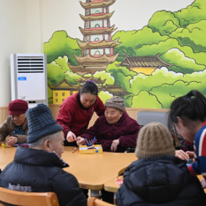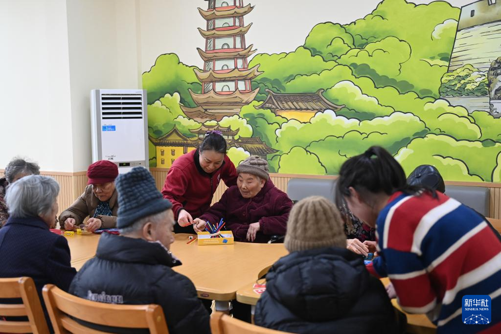 1月22日,在宁波市镇海区金生怡养院,护理员陪着一位失能老人在休闲区玩益智游戏。