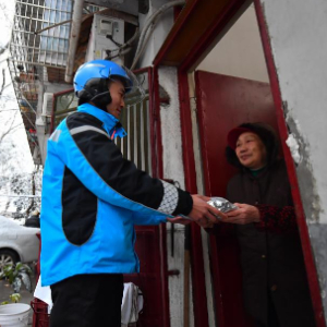 1月22日,在长沙市天心区裕南街街道东瓜山社区,外卖骑手志愿者尹超为73岁老人彭春辉送餐上门。