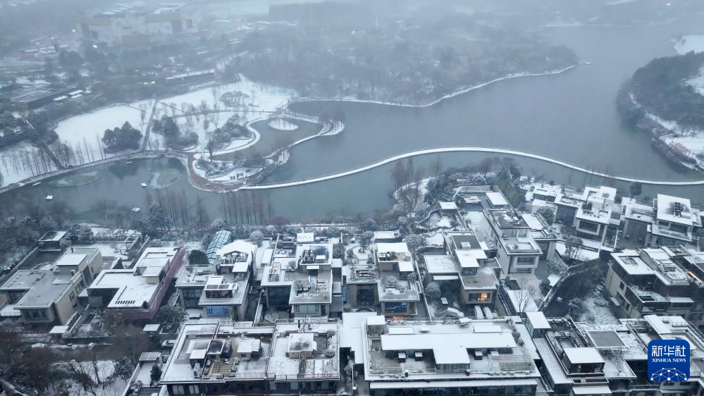 1月22日,贵阳市观山湖区阅山湖公园及周边房屋被白雪覆盖(无人机照片)。