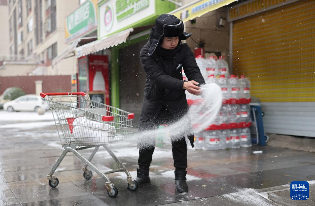1月22日,在贵阳市观山湖区一小区内,物业人员在撒盐防滑。