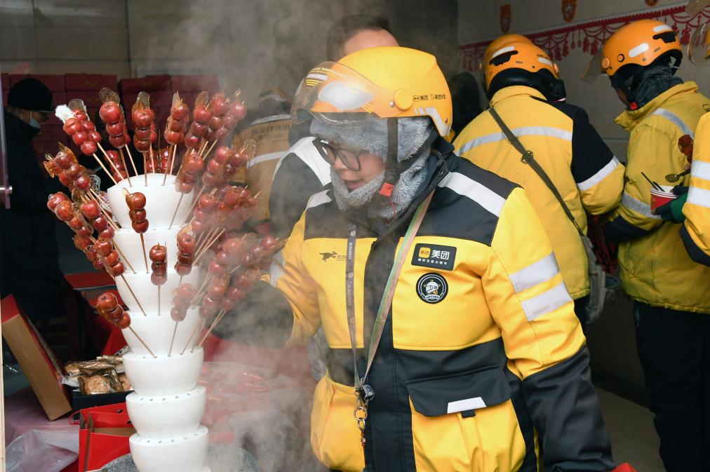 1月23日,在北京市海淀区北太平庄街道户外劳动者暖心驿站,一名外卖员(前)准备品尝糖葫芦。