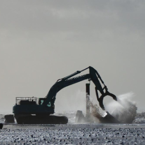 1月22日,挖掘机在英国布莱克浦附近海岸放置巨石以保护海岸。