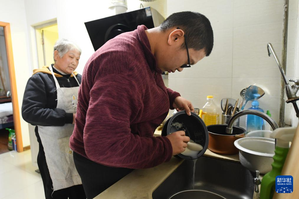 1月22日,鲍科言在家中帮母亲做饭。