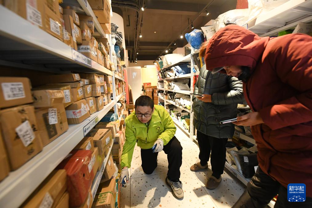 1月22日,鲍科言在快递驿站将快递整理上架。