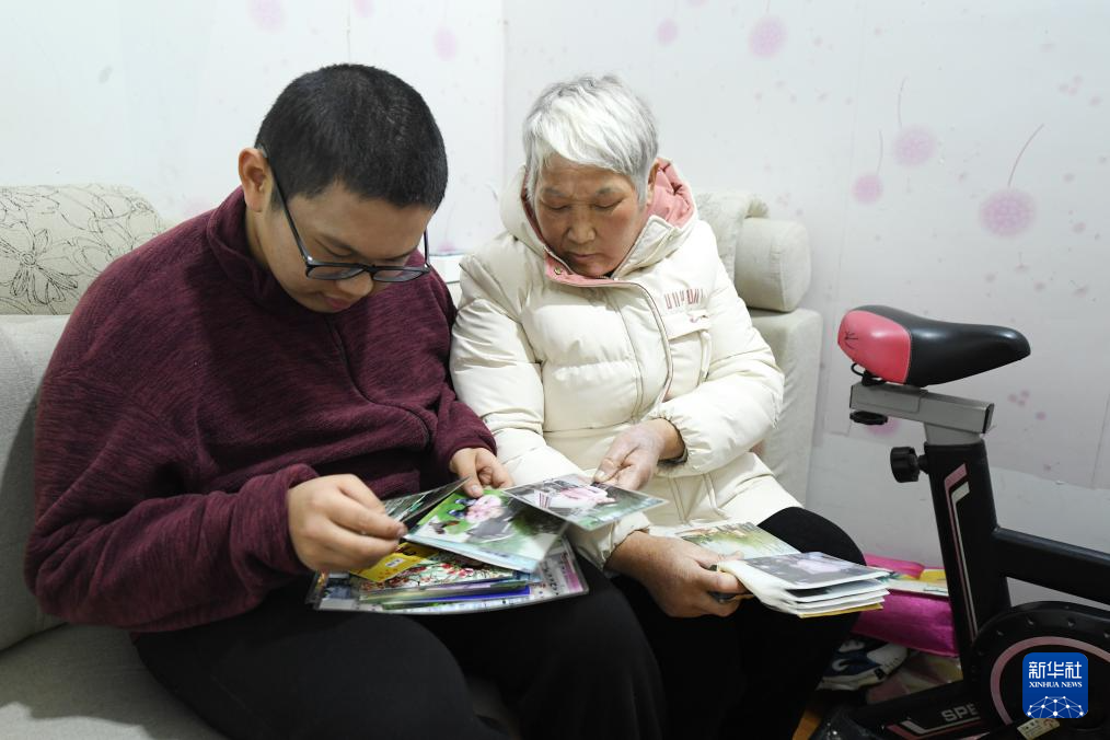 1月22日,鲍科言和母亲张菊芬在家中翻看相册。