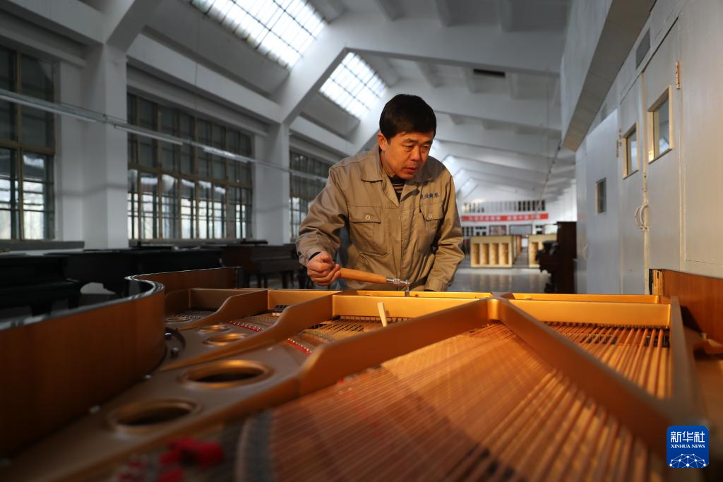 1月23日,在东北钢琴乐器有限公司车间,张永庆给钢琴调律。