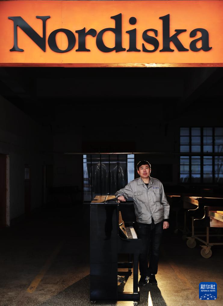 1月23日,在东北钢琴乐器有限公司车间,张永庆和他调试好的钢琴合影。