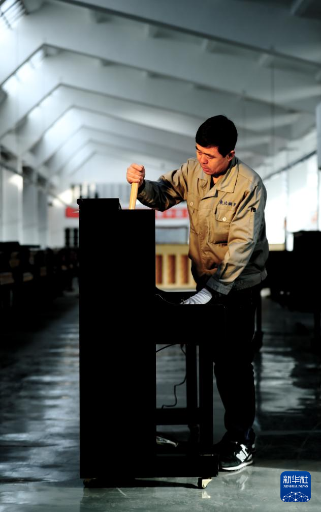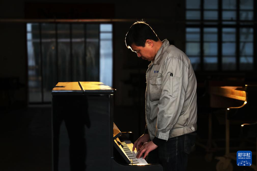 1月23日,在东北钢琴乐器有限公司车间,张永庆在钢琴出厂前检查音准。
