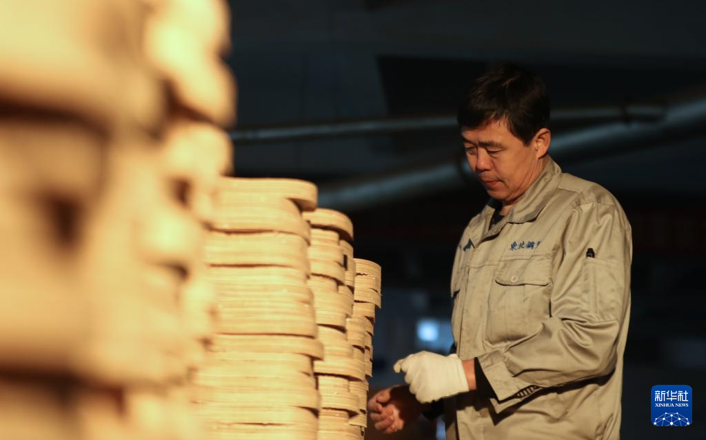 1月23日,在东北钢琴乐器有限公司车间,张永庆查看制作钢琴所需木料储存情况。