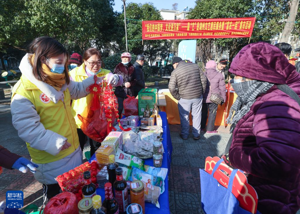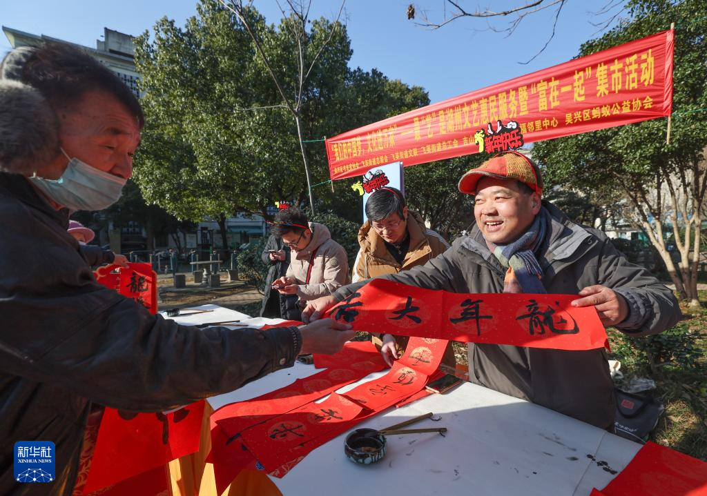 新春佳节临近,浙江省湖州市吴兴区飞英街道文联、总工会联合吴兴区书法家协会等在吉山四社区、新华苑社区等多个社区开展“我们的中国梦,文化进万家”湖州文艺惠民服务暨“富在一起”共富集市活动,通过现场写春联送春联、为居民提供免费理发、缝补服务、义诊服务,设置共富集市售卖农产品等活动内容,为居民百姓提供民生实事便民服务,营造节日气氛。