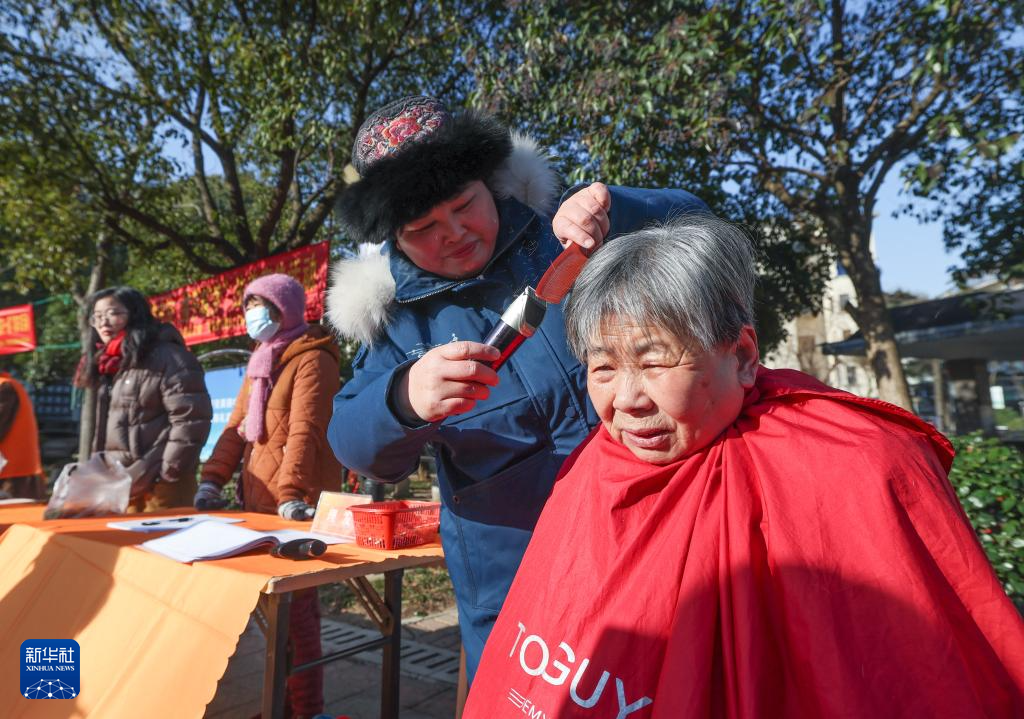 1月24日,在飞英街道吉山四社区的新春共富集市上,志愿者为居民提供免费理发服务。