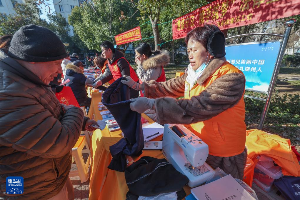 1月24日,在飞英街道吉山四社区的新春共富集市上,志愿者为居民提供免费缝补服务。