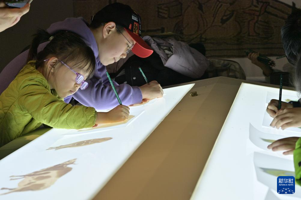 1月24日,小观众在“盛世修典‘中国历代绘画大系’主题展——‘久久为功’品读书画中的中华文脉”展览现场临摹古画。