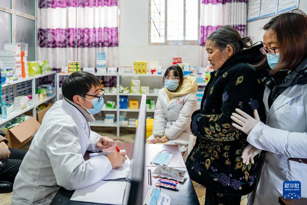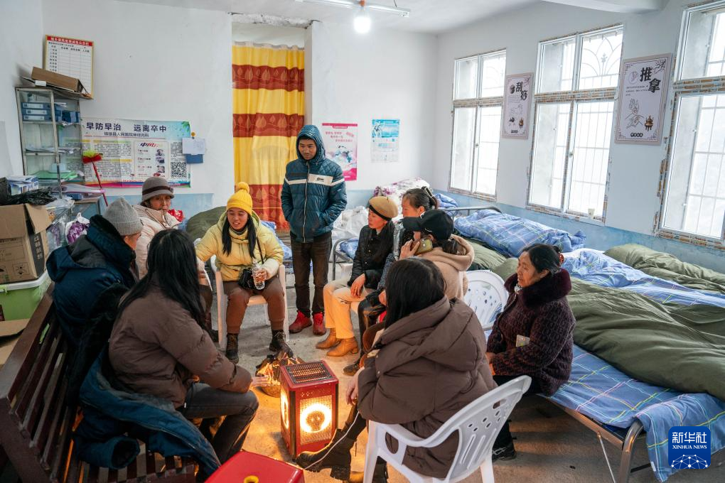 1月24日,在镇雄县塘房镇凉水村和平小学老校区安置点,医生在临时医疗点给受灾群众看病。
