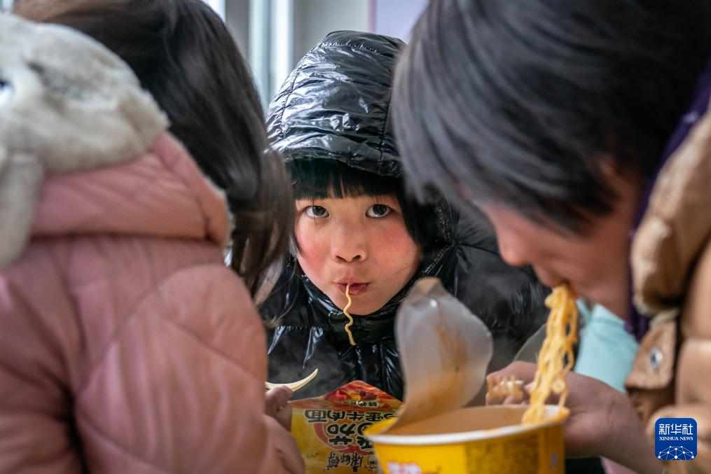 1月24日,小朋友在镇雄县塘房镇凉水村和平小学老校区安置点吃泡面。