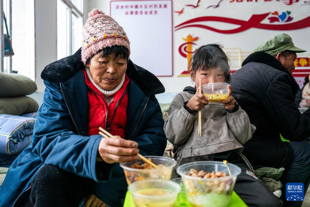 1月24日,受灾群众在镇雄县塘房镇凉水村和平小学老校区安置点吃饭。