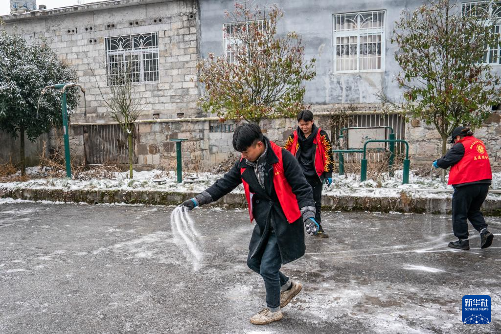 1月24日,在镇雄县塘房镇凉水村和平小学老校区安置点,志愿者在结冰的地面上撒盐防滑。