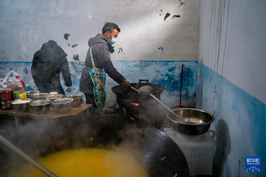 1月24日,在镇雄县塘房镇凉水村和平小学老校区安置点,周边村寨的村民帮忙炒菜。